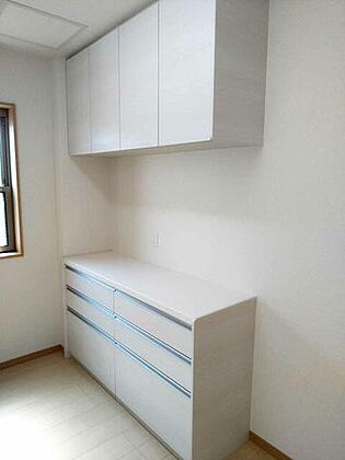 炊飯器・電子レンジが置けるスペース有。ティーカップや食器、食品ストックも収納できるお洒落なカップボード付きです。