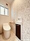 オシャレな壁紙のシンプルなトイレです。独立型手洗い器があり、ドアノブを触る前に石鹸で手を洗えます♪