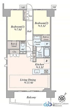 南東向きの明るいバルコニー。リビング・ダイニングに面している為、空間の広がりを感じさせてくれるスペースとなっております。