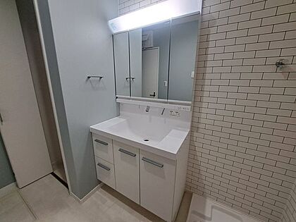 洗面台はヒーターレスでも曇りにくいミラーを採用しています。お風呂上りのスキンケアやドライヤーも視界クリアで使い勝手良好です。毎日使うものだからこそこだわりたいポイント。