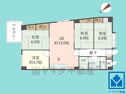 4LDK、専有面積78.79平米、バルコニー面積4.4平米、3階建て2階部分の南東角部屋。