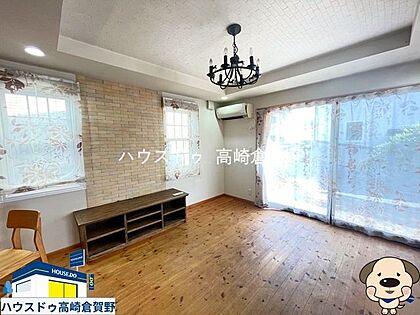 南向きの大きな窓から光がたっぷり入る明るいリビング。おしゃれな照明と温もりある床で家族が集まる心地よい空間です。