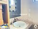 丸型ボウルの洗面台とタイル付きミラーが目を引く、カフェのような洗面空間。朝の支度も気分が上がります♪