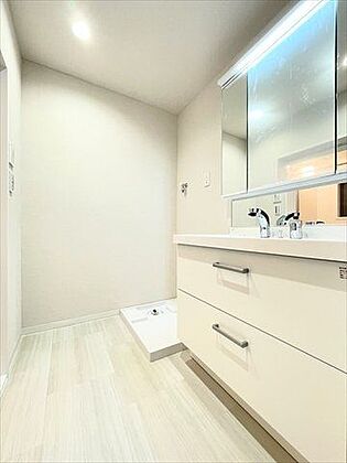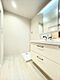 洗面台の鏡裏は収納スペースになっています。隠す収納でスッキリ周辺を片付けることが出来ます。小さめのドライヤーならすっぽり収まります。