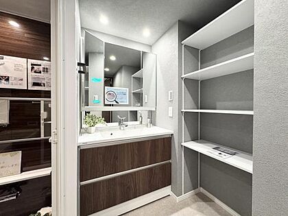 ≪洗面化粧台≫ 複数人でも利用可能な三面鏡を採用した洗面化粧台になります。