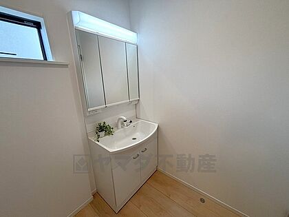 三面鏡にハンドシャワー付きで使いやすい洗面台です^^鏡裏と洗面ボウル下に収納付きの洗面台なので、整理整頓ができスッキリと使えます^^