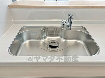大きなお鍋も楽々洗える幅の広いシンクです^^ステンレスシンクなので簡単にお掃除できますよ。洗剤やスポンジもすっきりできる収納付き。