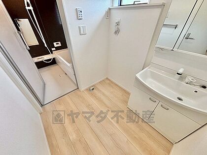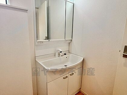 三面鏡にハンドシャワー付きで使いやすい洗面台です^^鏡裏と洗面ボウル下に収納付きの洗面台なので、整理整頓ができスッキリと使えます^^
