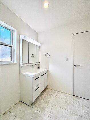 大きく見やすい三面鏡で清潔感ある洗面台は、身だしなみチェックや肌のお手入れにおすすめです。