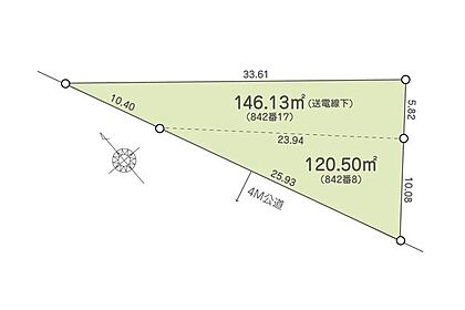 【接道】 一方 cc0481 三角地、土地面積に高圧線下(建築不可部分)146.13m2を含みます。※地役権設定有、建築形態規制B地区 景観法/航空法 |