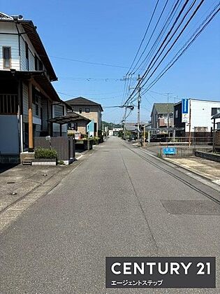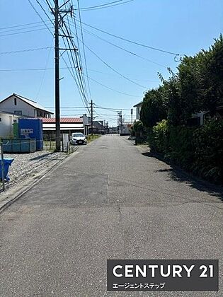 周辺の住宅が整然と並ぶ前面道路の様子です。道幅が確保されており見通しの良い環境が広がっています。電線や標識も整然と配置され落ち着いた雰囲気が感じられる現地写真です。住環境の確認に最適な一枚です。