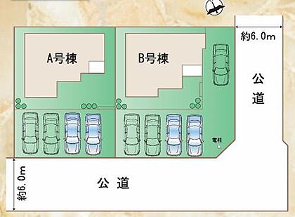 約6.0mの幅広い公道に面した区画図です。A号棟・B号棟それぞれ駐車スペースがしっかり確保されています。車の出し入れがしやすい配置になっています。角地部分もあるため開放感を感じる設計です。