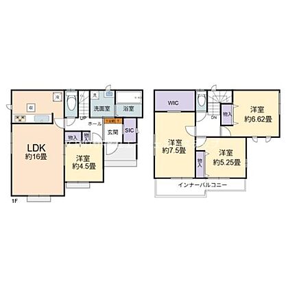 全体的にゆったりとした間取りが特徴です。1階には約16畳のLDKがあり4.5畳の洋室も備えられています。2階には広めの洋室が3部屋配置されており7.5畳や5.25畳など幅広い用途に使えます。