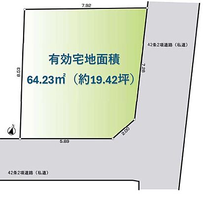 | 土地面積/坪(坪単価) | 64.23m2(実測)/19.46坪(334.00万円) | 代表的な接道 | 角地 私道 東 3.2m、南 2m ※詳細は備考欄をご確認ください |