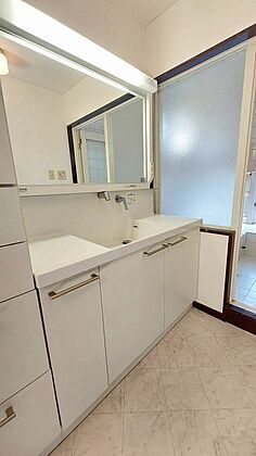 ご家族が並んで身支度ができる、ゆとりある洗面台です。洗面ボウル下や洗面台横に収納がございます。【1階洗面所】