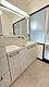 清潔感のある洗面所です。洗面台には、お手入れがしやすい繋ぎ目のない洗面ボウルが備わっています。【1階洗面所】