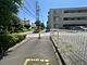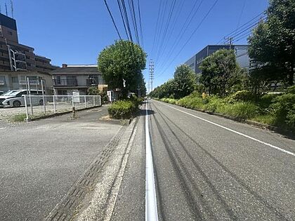前面道路は幅が広く車の出入りがしやすい印象です。道路沿いには緑が多く植えられています。周辺には住宅や建物もあり視界が開けています。電線も整然と配置されています。舗装状態も良好です。