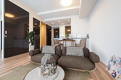 突然の来客でも、リビングに設えた収納にサッと物をしまえるので、瞬時にきれいに。