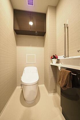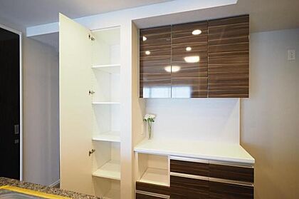 タオルや洗剤等をたっぷり収納できるリネン棚