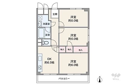 間取りは専有面積53.95平米の3DK。全居室洋室仕様のプラン。DKと続き間の洋室は、引き戸を開放してリビング代わりに使う事も出来ます。全居室に窓あり。バルコニー面積は7.15平米です。