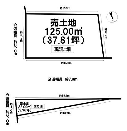 メインの土地と向かいの土地の間の道路です。公道幅員 約7.8mです。