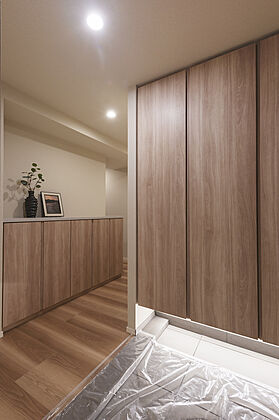 【玄関】フロートタイプのシューズボックスがあり、ご家族分の靴・シューケア用品を収納可能。廊下にも収納が備わっており、カウンター部分は飾り棚としてもご活用いただけます。
