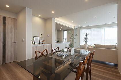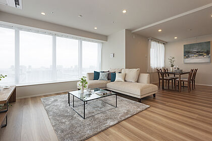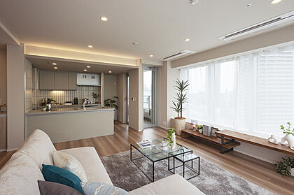 【LDK/約21.4帖】南東側から北東側にかけてコーナー窓を設置しており、たっぷりと陽光が入る明るい空間です。ゆっくりとご家族団欒の時間をお過ごしいただけます。