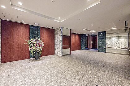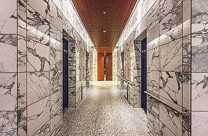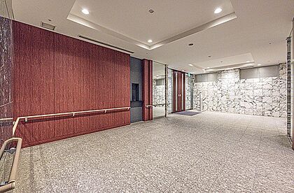 【エレベーターホール】ホテルライクな雰囲気のエレベーターホール。複数台のエレベーターがあり、朝の混雑時にもスムーズにご利用いただけそうです。