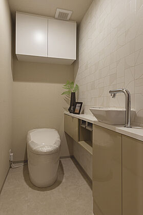 【トイレ】温水洗浄便座搭載で一年中快適にご利用いただけます。独立したカウンター・吊戸棚が備わっており、トイレットペーパーのストック・掃除道具などを収納可能です。