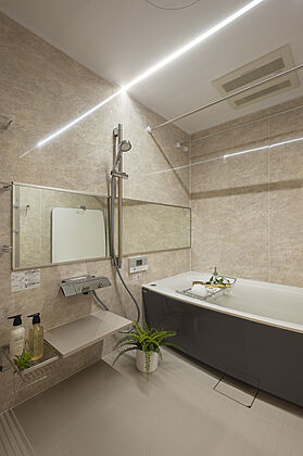【浴室】高級感のあるパネルを施した浴室です。浴室乾燥機搭載、雨の日や花粉の時期も気兼ねなく洗濯物を干すことができます。