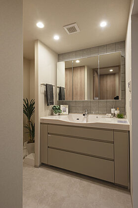 【洗面化粧台】3面鏡付きの洗面化粧台で、朝の身支度もスムーズに行えます。鏡裏・ボウル下に収納スペースが備わっており、洗面用具などを仕舞っていただけます。