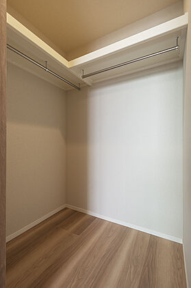 【WIC/約8.2帖洋室】L字にハンガーパイプ+枕棚が備わっており、衣類・鞄などをスッキリと仕舞うことができます。スーツケース・寝具などの嵩張る物も収納可能です。