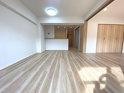 14.2帖のリビング。隣接する洋室と合わせて広々ご使用可能です。便利な可動棚付収納も完備!
