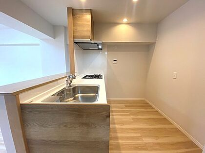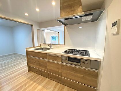 グリル付三口コンロや浄水機能付き水栓を完備した機能的なシステムキッチンです。