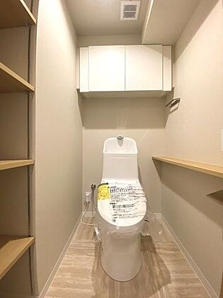 収納棚やカウンターを完備したトイレ。トイレットペーパーや掃除用品の収納も可能です。