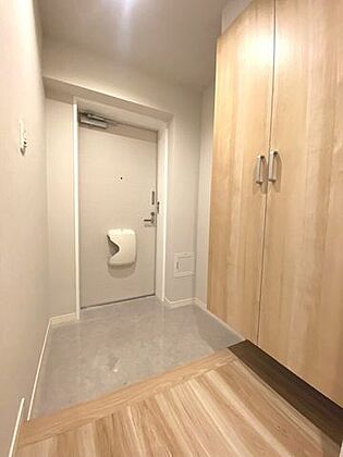 シューズボックスを設置した玄関。ナチュラルな色合いで落ち着いた印象に♪