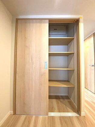 廊下収納もございます。可動棚付きで掃除用品や日用品の保管に便利ですね。