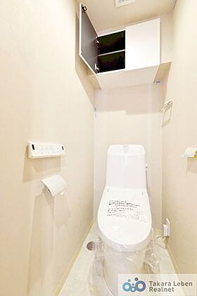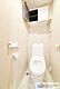 ウォシュレット機能付きのトイレ。収納付きで、便座がスッキリした印象となり、限られた空間を広く見せる効果があります。
