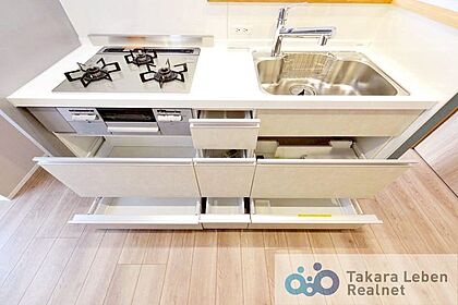 嬉しい3口コンロ。収納はスライド式の為、奥にしまい込んだ調理器具等の取り出しもスムーズに行えるため、調理がはかどりますね