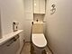 〜トイレ〜 上部に吊戸棚が設置された温水洗浄機能のトイレです。