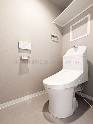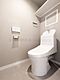 白を基調にした清潔感のあるトイレには、便利な棚板を設置
