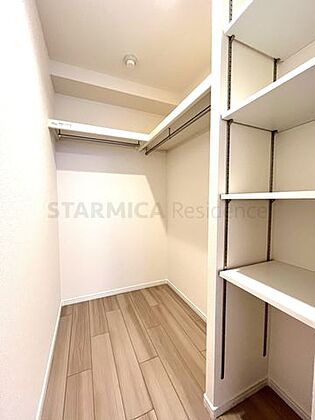 ハンガーパイプと可動式の棚を合わせたウォークインクローゼットはより多くの物が収納可能です