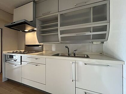 収納力ある吊戸棚付きのシステムキッチンです。ご家族の顔を見ながら料理を楽しんで頂けますね