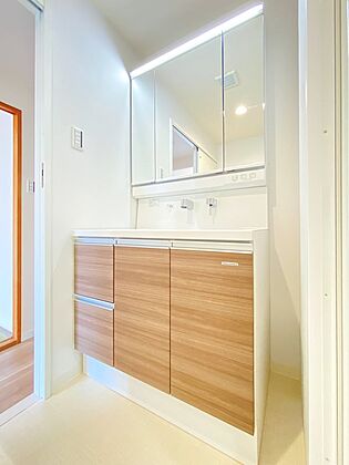 三面鏡付洗面化粧台【Takarastand エリシオ】採用。ミラー裏にはたっぷりの収納スペースや、コンセント付きで朝の支度もスムーズに〇小物の収納に便利な引き出し戸組み合わせタイプ。