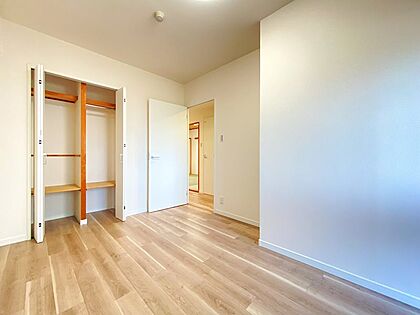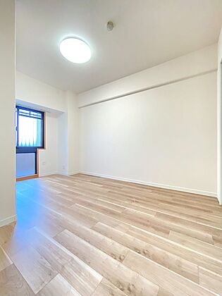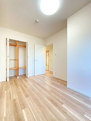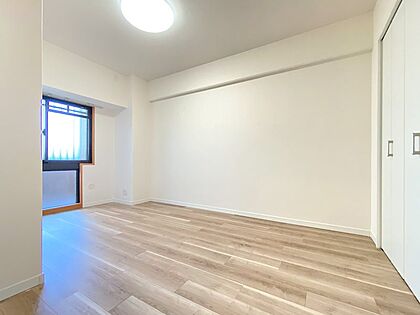 収納充実の6.1帖洋室。フローリング・クロス貼替済、建具交換済みのため気持ちよくご利用いただけます。白基調・木目フローリングのシンプルなデザインで、どんな家具家電を置こうか楽しみになります。