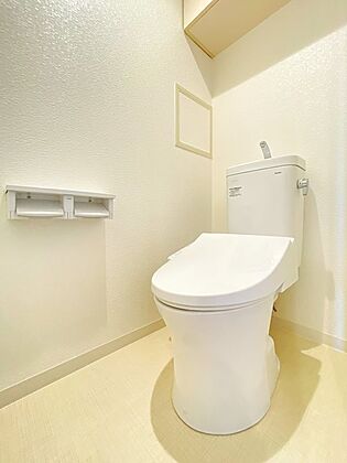 ウォシュレット付トイレ【TOTO ピュアレスト】採用。節水性に優れた点や便器裏のフチが浅い形状のためお手入れがしやすい点なども嬉しいポイントですね。上部戸棚付きで備品等はすっきり収納可能です〇