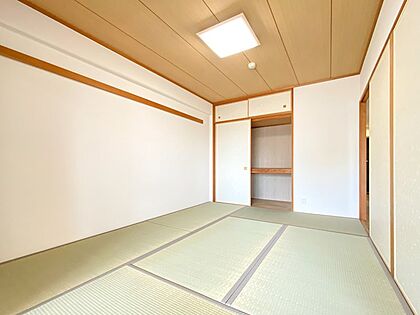 6帖和室。大容量の押し入れ収納が嬉しいですね。客間として、家事の合間の休憩場として、お子様の遊び場として‥など、状況に応じてさまざまご利用いただけます。畳表替え済み、襖貼替済みです。