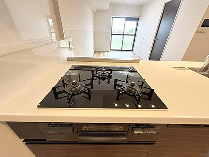 3口ガスコンロ付きシステムキッチン。ガスは火力が強いので様々なお料理に向いています。