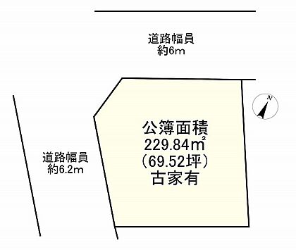 | 土地面積/坪(坪単価) | 229.84m2(登記簿)/69.65坪(40.20万円) | 代表的な接道 | 角地 公道 南西 6.2m、北西 6m ※詳細は備考欄をご確認ください |