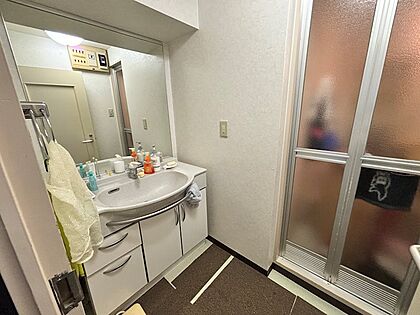 洗面脱衣所になります。大型の鏡付の洗面台もございます。